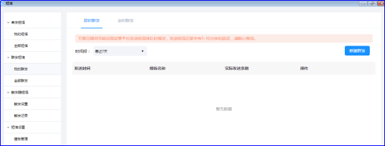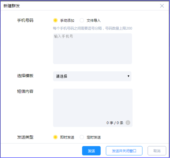 3. 点击新建短信,进行创建,填写手机号码,可以选择模板,编写短信内容,支持即时发送和定时发送。点击发送即可,秒级送达。