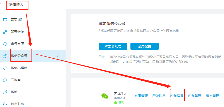1.在米多客[设置中心]-[渠道接入]-[微信公众号]点击[粉丝海报]即可进入粉丝海报功能。