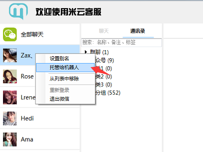 点击微信头像,选择【托管机器人】,即可将微信号进行托管;取消托管也是同样操作。被托管的微信号会在微信头像右上角有一个机器人标注,方便区分。