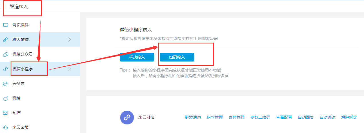 点击【设置中心】-【渠道中心】,进入小程序,使用小程序的管理员账号进行扫码,即可轻松完成绑定。