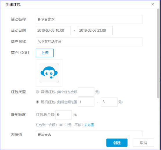 3. 点击创建红包,选择普通红包或者随机红包,填写活动名称、活动日期、商务名称、祝福语等内容,设置好领取条件,选择对应的公众号,点击创建就完成了。