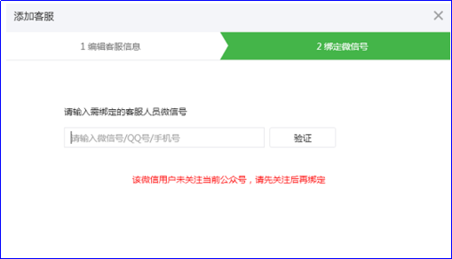 4.输入需绑定的客服人员微信号,点击输入框旁的“验证”,确认此微信号已经关注公众号后,即可邀请其绑定。