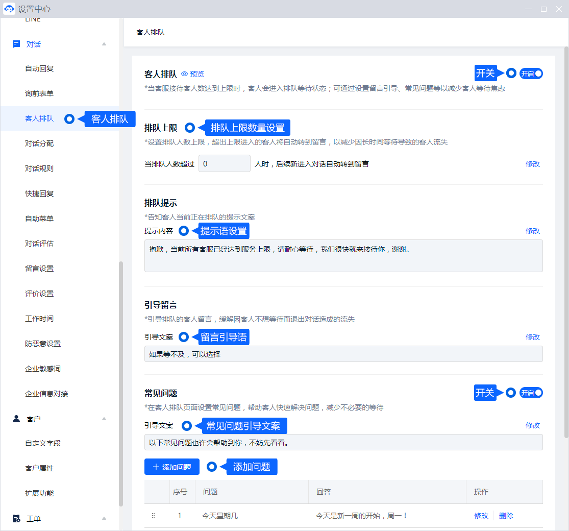客人排队功能在「设置中心 - 对话 - 客人排队」中即可设置。