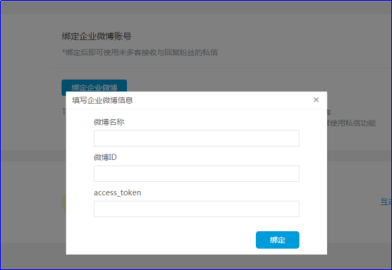进入微博主页获取到微博名称、微博ID、access_token,然后填写好内容,点击绑定即可。
