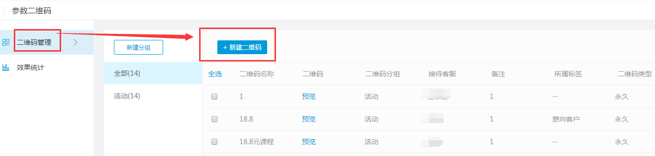 3. 然后选择【公众号】-【参数二维码】,点击“新建二维码”