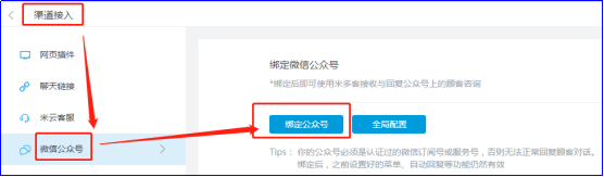 首先登录米多客后台,在【设置中心】-【渠道接入】-【微信公众号】中,点击绑定公众号,使用公众平台绑定的管理员个人微信号扫描二维码即可完成接入。