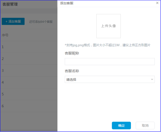 添加客服人员的操作很简单,点击添加客服按钮,支持自定义上传头像,设置客服昵称和客服名称,其中客服昵称是粉丝端所见,可以根据企业特点进行设置,客服名称是企业端所见,一般是客服真实姓名,方便对客户工作情况进行考察。