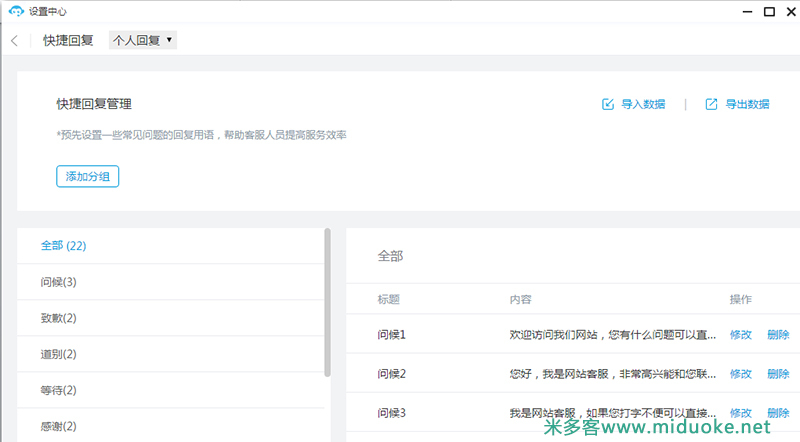 同时还可以将常用的对话内容进行分类整理到米多客知识库,轻松的对不同的访客快速应答,一键回复,体现专业,节省效率。