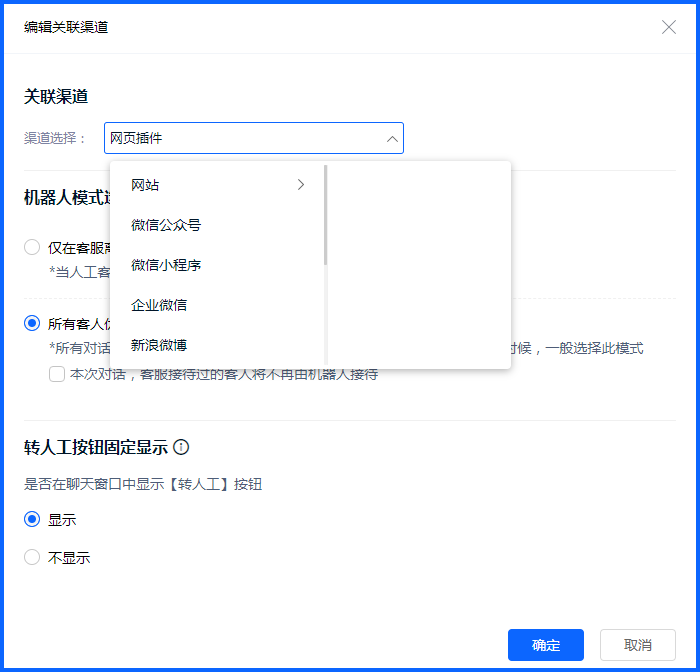 在「机器人 - 机器人设置 - 基础设置」页面中的【关联渠道】模块,支持设置机器人接待指定网站/第三方平台的客人对话。目前全渠道支持,如:网站、微信公众号、微信小程序、企业微信、新浪微博、抖音企业号、头条小程序、小程序插件、百度BCP、微信客服、Messenger、Line、APP接入等。